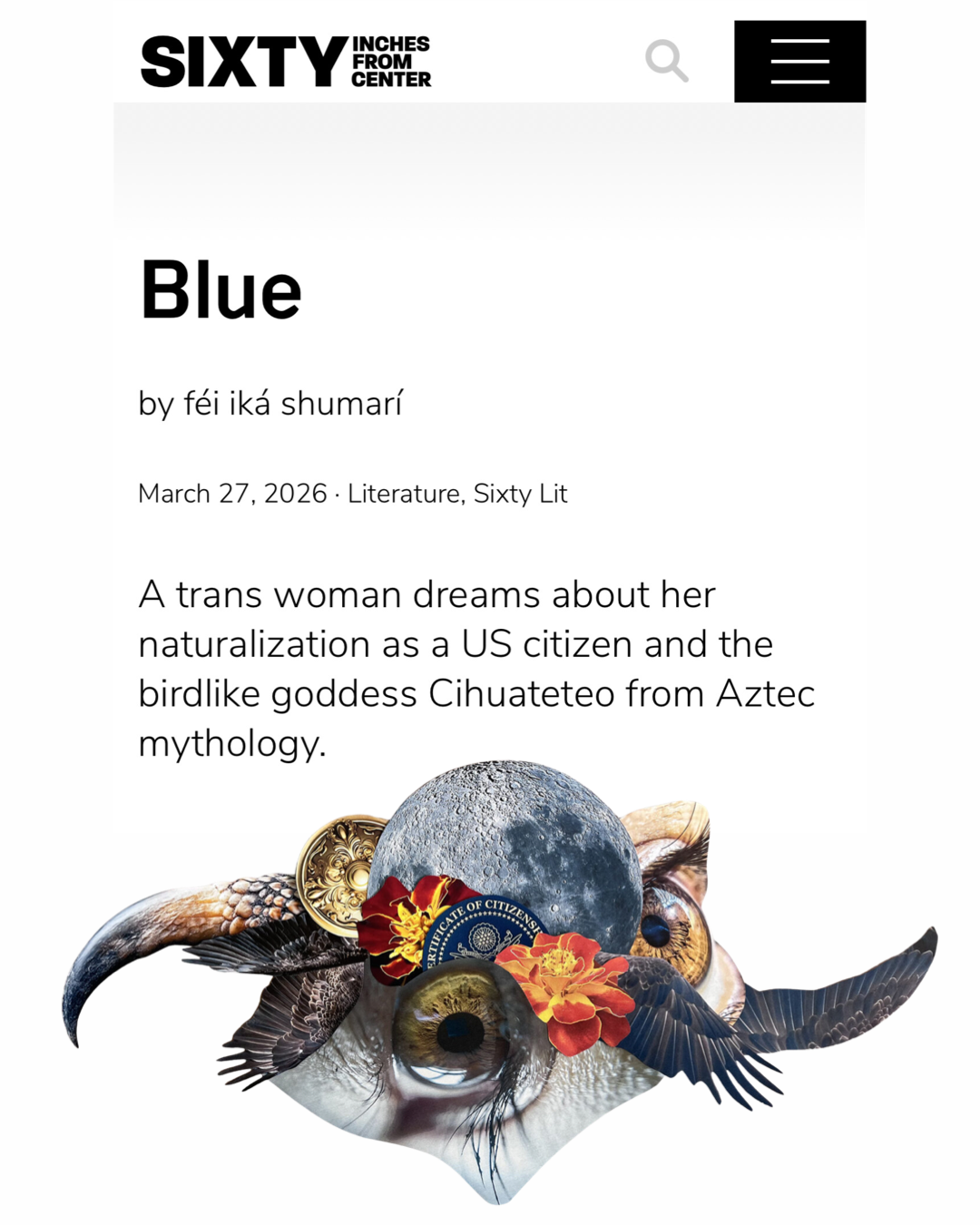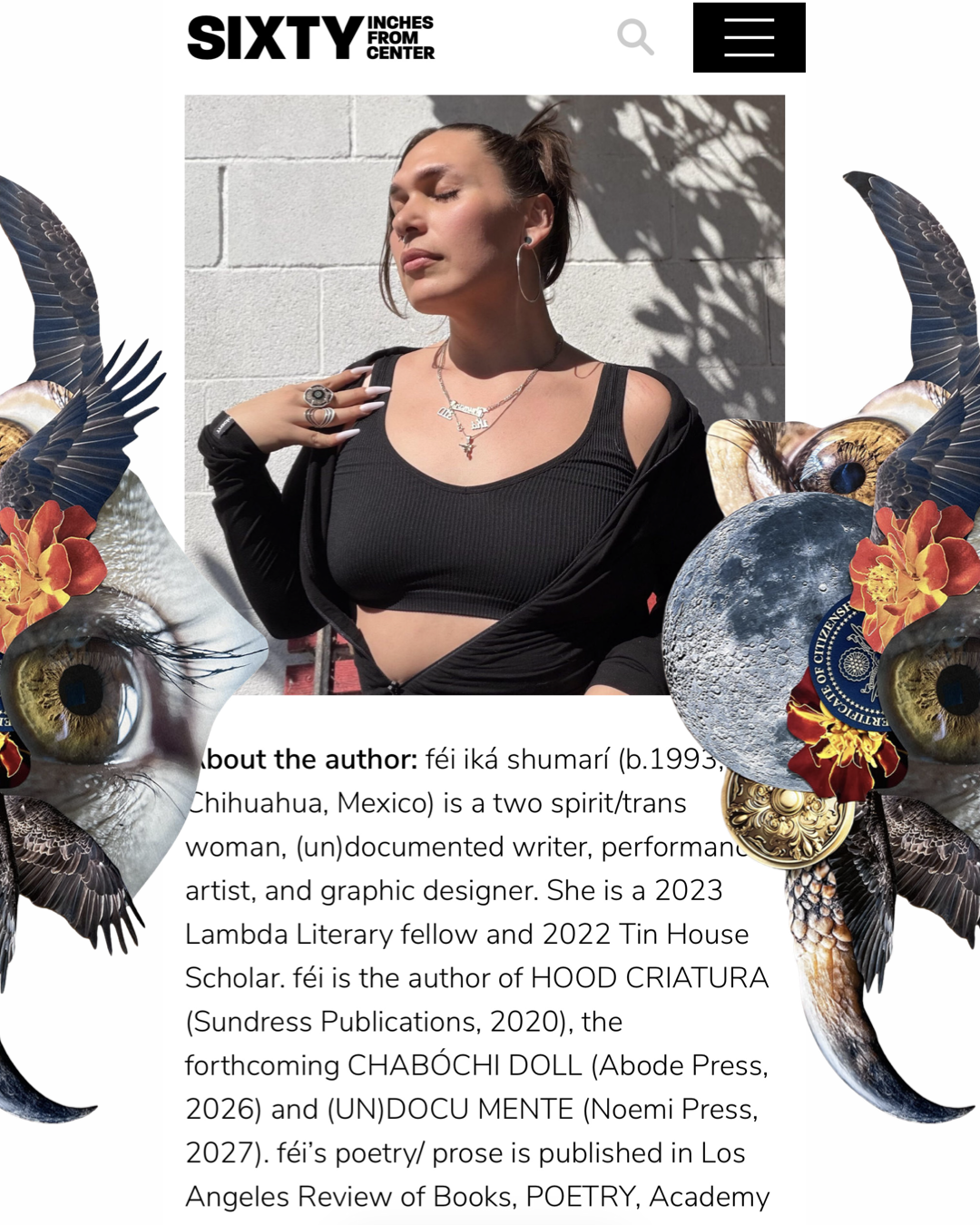 féi iká shumarí, otherwise known as féi hernandez (b.1993, Chihuahua, Mexico) is a two spirit/trans, (un)documented writer, visual artist, and healer. She is a 2023 Lambda Literary fellow and 2022 Tin House Scholar. féi is the author of HOOD CRIATURA (Sundress Publications, 2020), the forthcoming (UN)DOCU MENTE (Noemi Press, 2025) and CHABÓCHI DOLL (Abode Press, 2026). féi’s poetry/ prose is published in Los Angeles Review of Books, POETRY, Academy of American Poets, Hayden Ferry’s Review, Oxford Review of Books, TransLash Media, Somewhere we are Human( Harper Collins, 2022), Here to Stay (Harper Collins, 2024), Split This Rock, F News Magazine, and more. féi is descendent of the Pi’ma, Rarámuri, and Cora peoples. For more of her projects, designs, services and products visit: feiikashumari.com